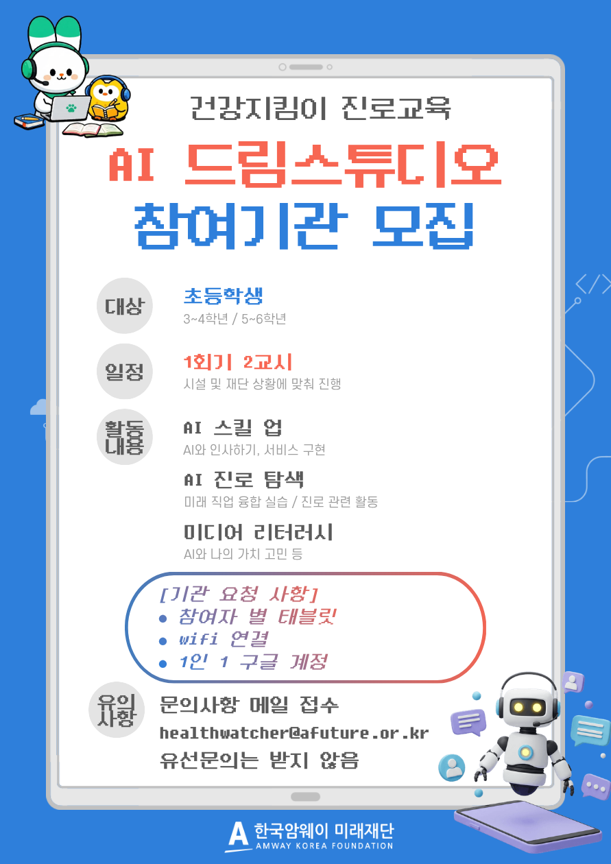 - 기타 문의 및 제출처: healthwatcher@afuture.or.kr 이메일 문의 / 재단 내부사정으로 유선문의는 받지 않음.